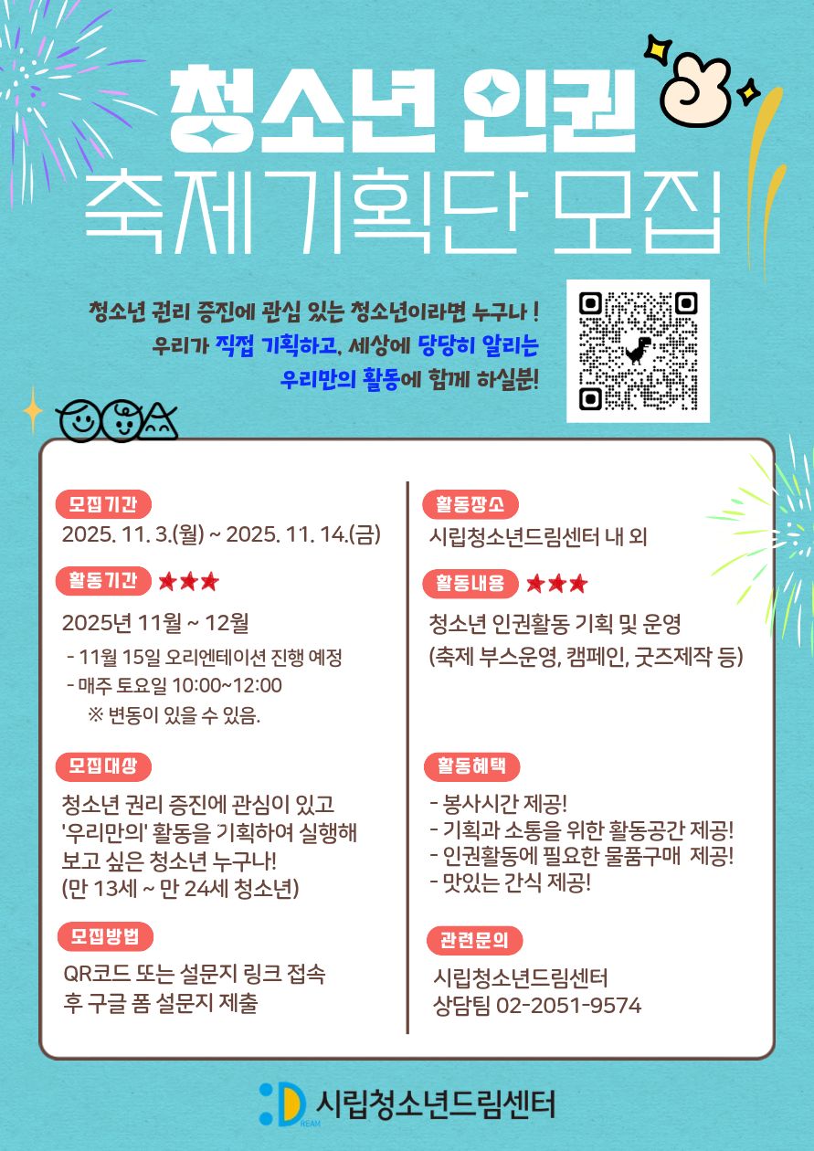 시립청소년드림센터에서 <청소년 권리 증진> 활동에 관심이 있는 청소년 소수 인원을 추가 모집합니다!
