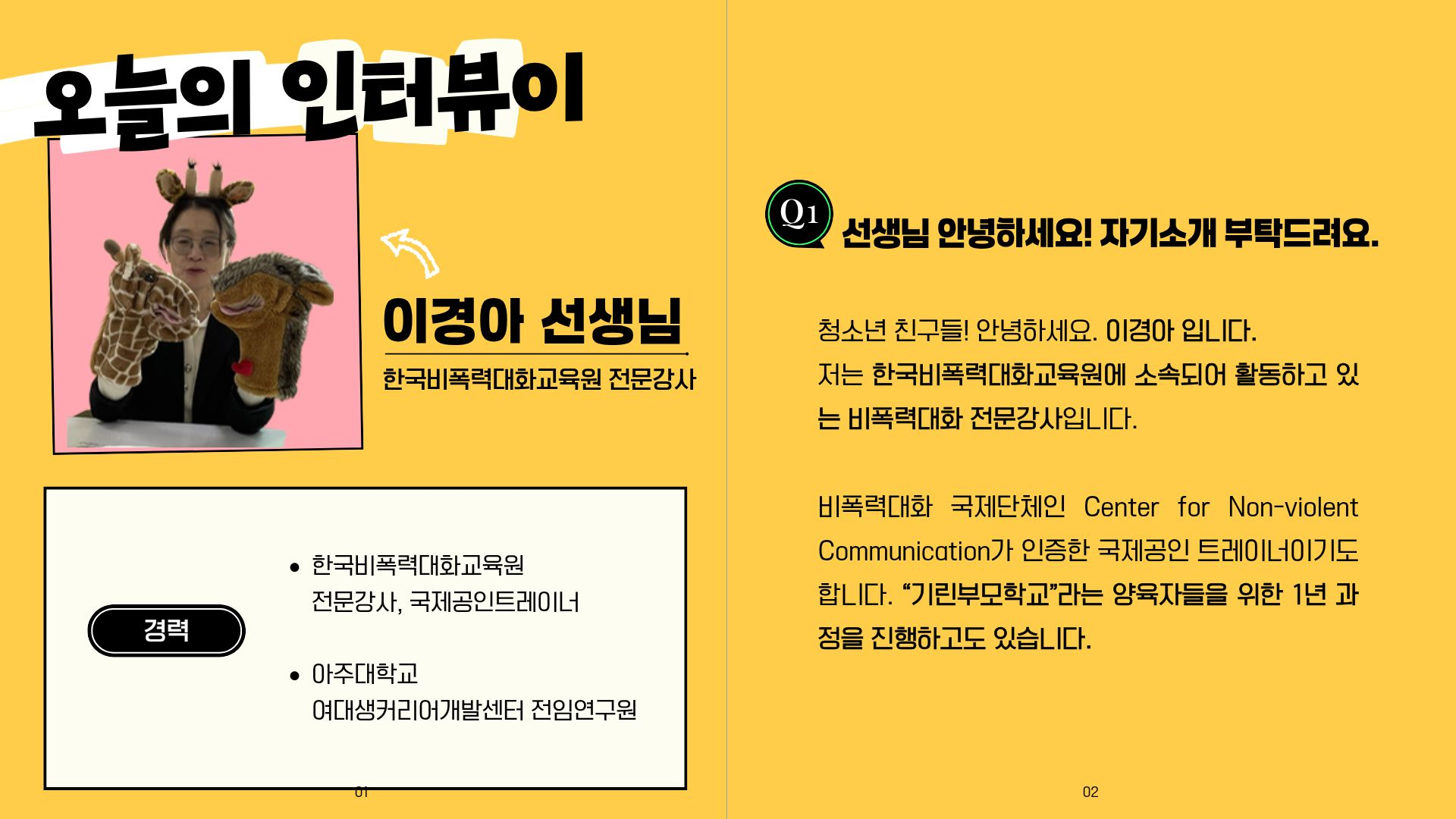 제 3차 청소년 알권리 인터뷰집은 <한국비폭력대화교육원> 전문 강사이시자 Center for Non-violent Communication이 인증한 국제공인 트레이너인 이경아 전문가님과 함께 「비폭력 대화」 에 관한 이야기를 나눴습니다.